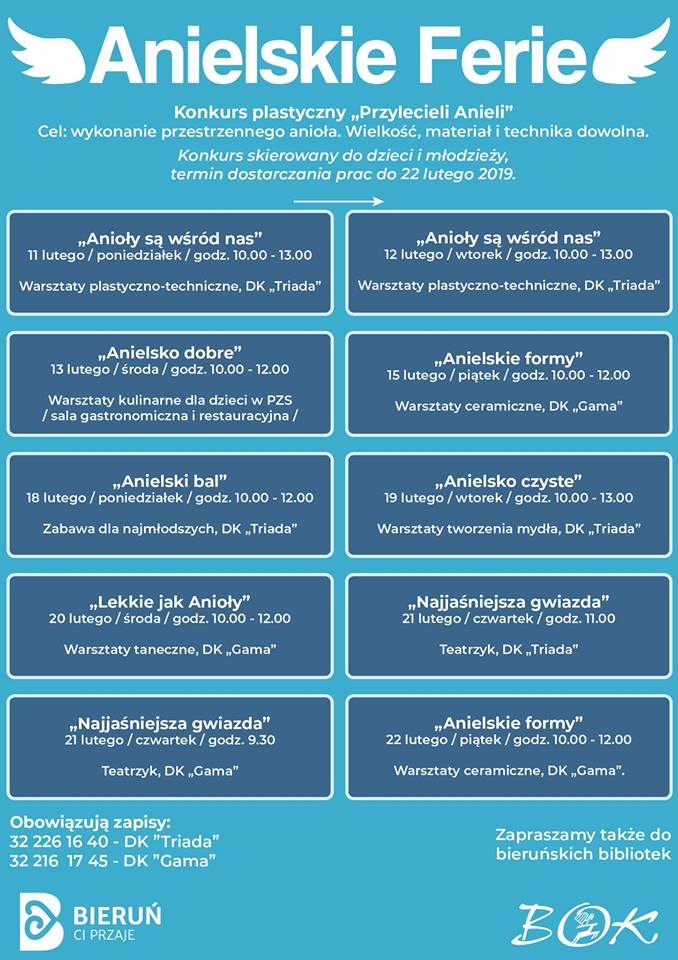 Aktualności 8 Lutego 2019Zachęcamy do zapoznania się z bogatą ofertą zajęć oraz wyjazdów, które dla dzieci i młodzieży na tegoroczne ferie zimowe przygotowały Bieruński Ośrodek Kultury oraz Bieruński Ośrodek Sportu i Rekreacji.