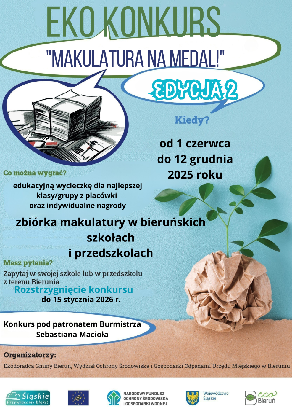 Aktualności 12 Czerwca 2025Przypominamy - trwa II edycja konkursu ekologicznego „Makulatura na Medal - Zbieraj z Nami dla Planety!”, organizowanego pod patronatem Burmistrza Bierunia Sebastiana Macioła.