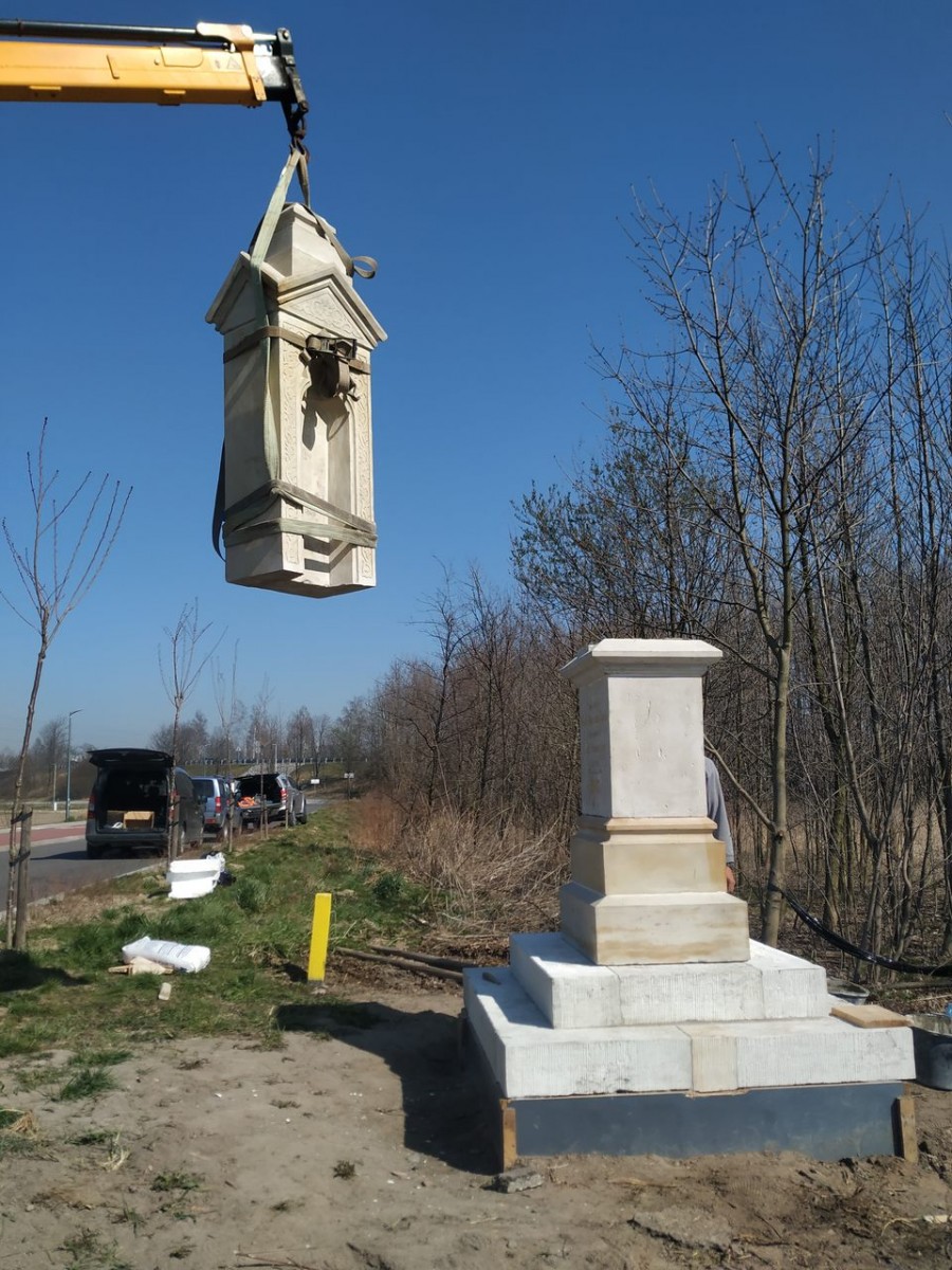 Aktualności 9 Kwietnia 2020Prace związane z relokacją i konserwacją zabytkowego krzyża Męki Pańskiej z 1907 r. postępują. Obecnie Krzyż został już przewieziony do nowej lokalizacji.