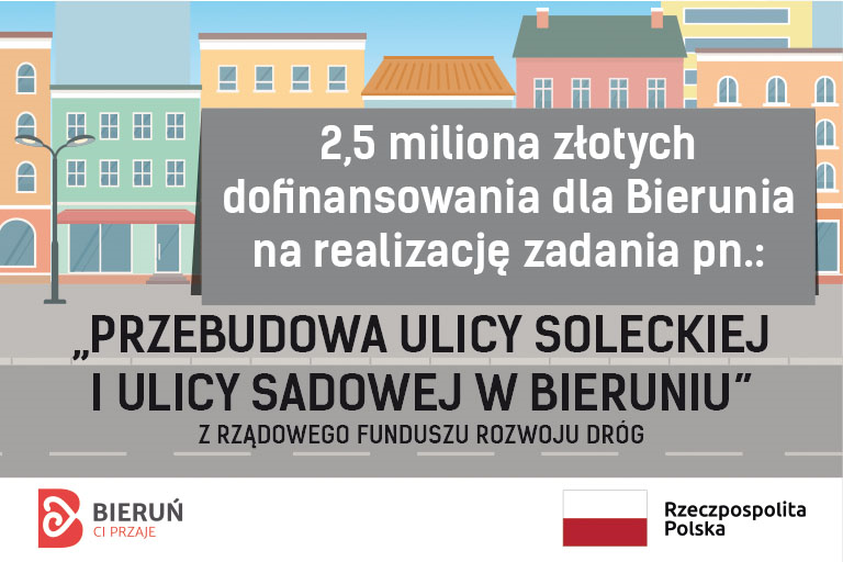 Aktualności 21 Lutego 2023Świetne wieści! Zdobyliśmy dofinansowanie w wysokości 2,5 miliona złotych na gruntowną przebudowę ważnego ciągu komunikacyjnego w nowobieruńskiej części miasta! Mowa tu o ulicach Solecka i Sadowa, które od dawna czekały na remont. Dzięki środkom z Rządowego Funduszu Rozwoju Dróg, prace na odcinkach o łącznej długości prawie 800 metrów zrealizowane zostaną maksymalnie w ciągu 12 miesięcy.