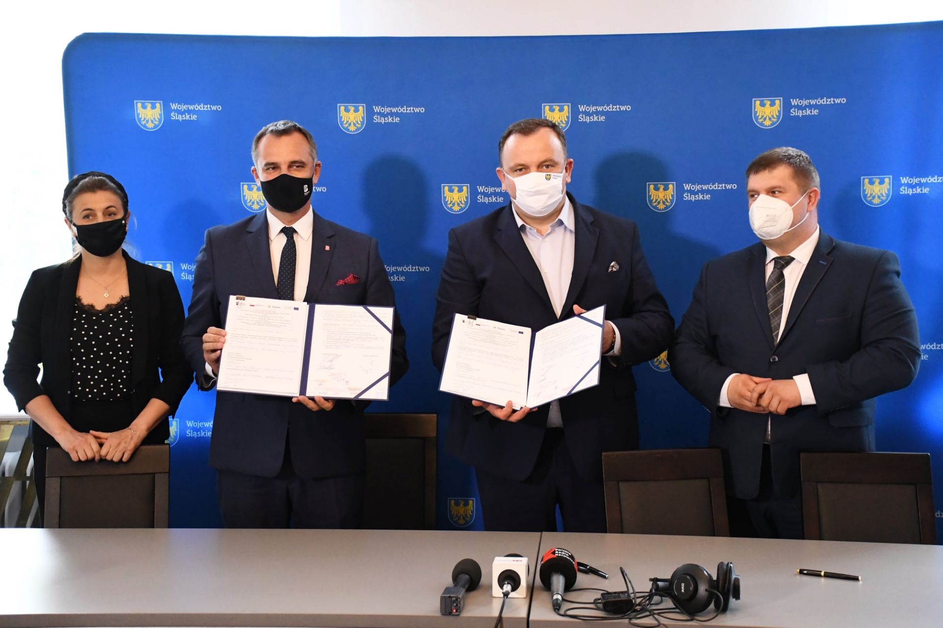Umowę podpisali (od lewej): Skarbnik Miasta Bierunia Dorota Przybyła, Burmistrz Miasta Bierunia Krystian Grzesica, Marszałek Województwa Śląskiego Jakub Chełstowski, członek Zarządu Województwa Śląskiego Wojciech Kałuża