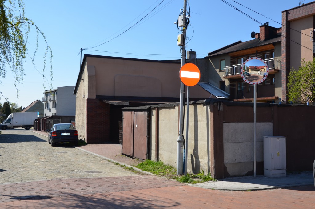 umieszczono lustra drogowe, które mają za zadanie poprawić bezpieczeństwo poprzez eliminację martwych punktów w miejscach, gdzie widoczność jest ograniczona.