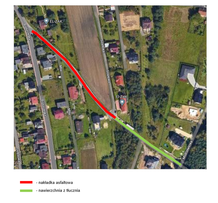 - wymianę nawierzchni z tłucznia na odcinku o długości 140 metrów od ul. Sosnowej do ul. Modrzewiowej.