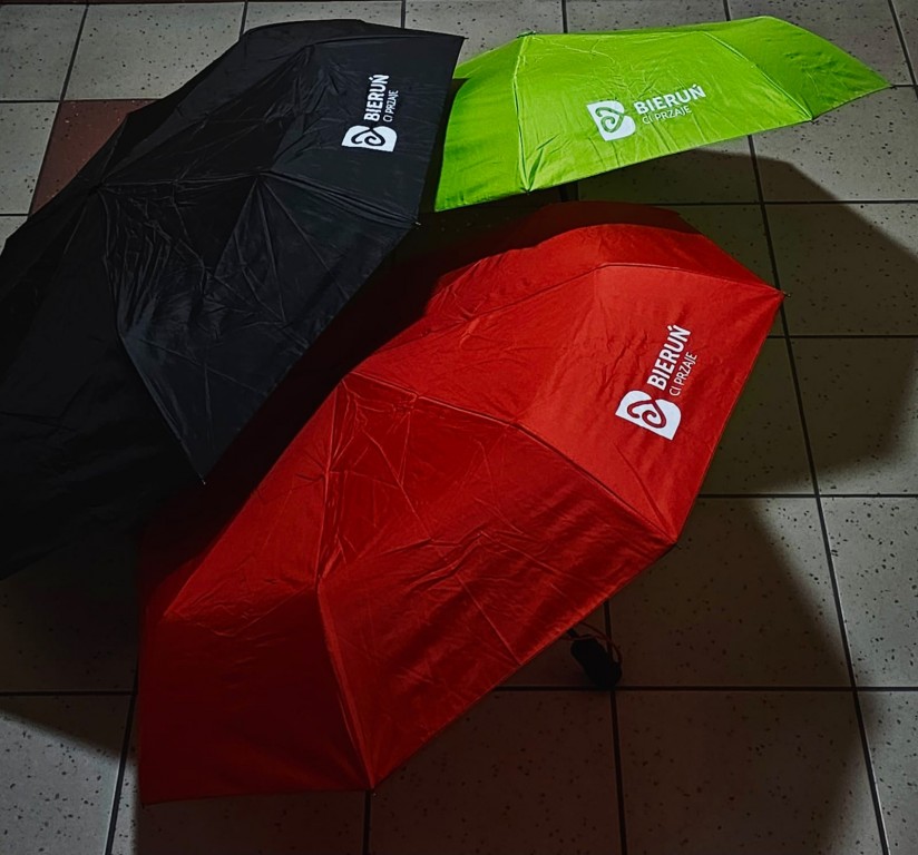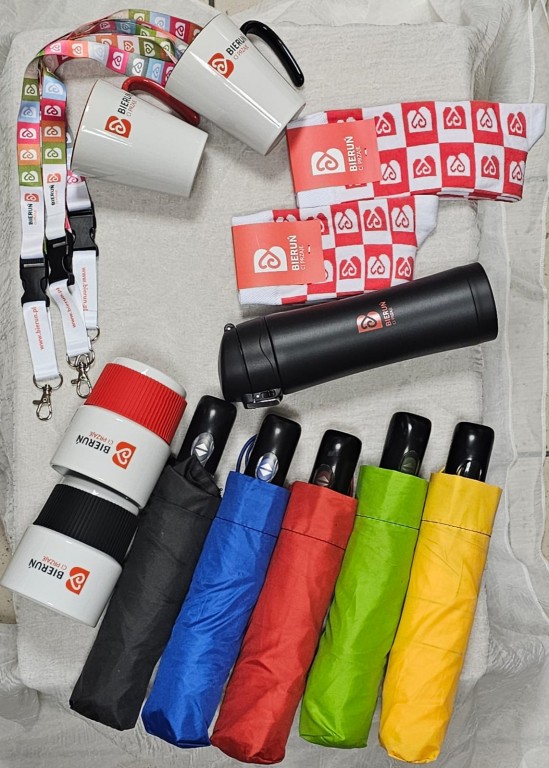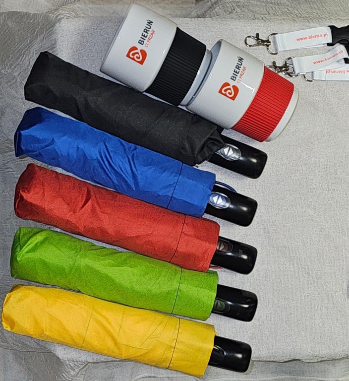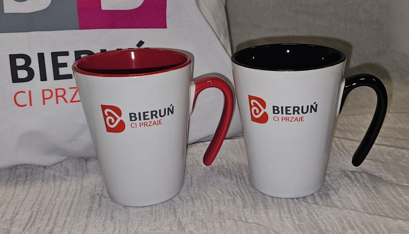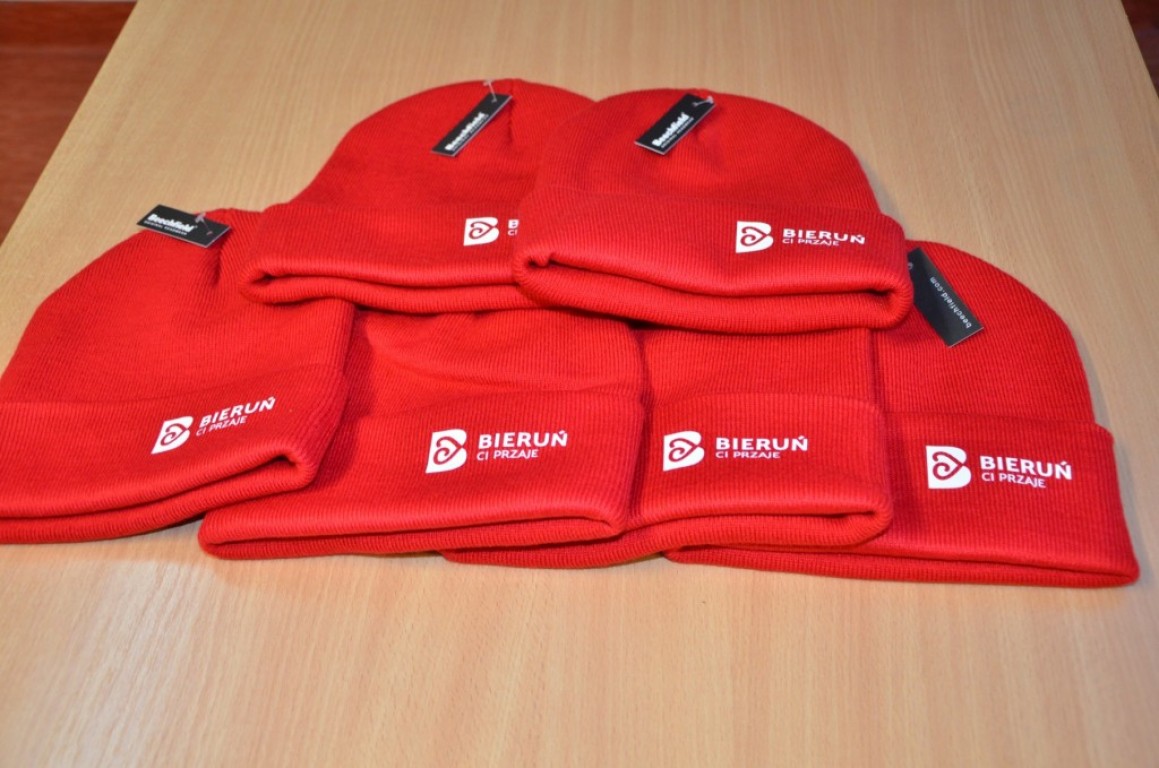 Czerwone czapki zimowe; parasole składane dostępne w pięciu kolorach - niebieskim, czerwonym, żółtym, limonkowym i czarnym; kubki termiczne - czarne i biało-czerwone, kubki ceramiczne - dwa różne modele, każdy w dwóch kolorach; T-shirty z logo Bieruń Ci Przaje i bawełniane torby - to największe hity gadżetowe sygnowane logiem Bieruń Ci przaje, które kupić można w Urzędzie Miejskim w Bieruniu. Zachęcamy do nabywania!