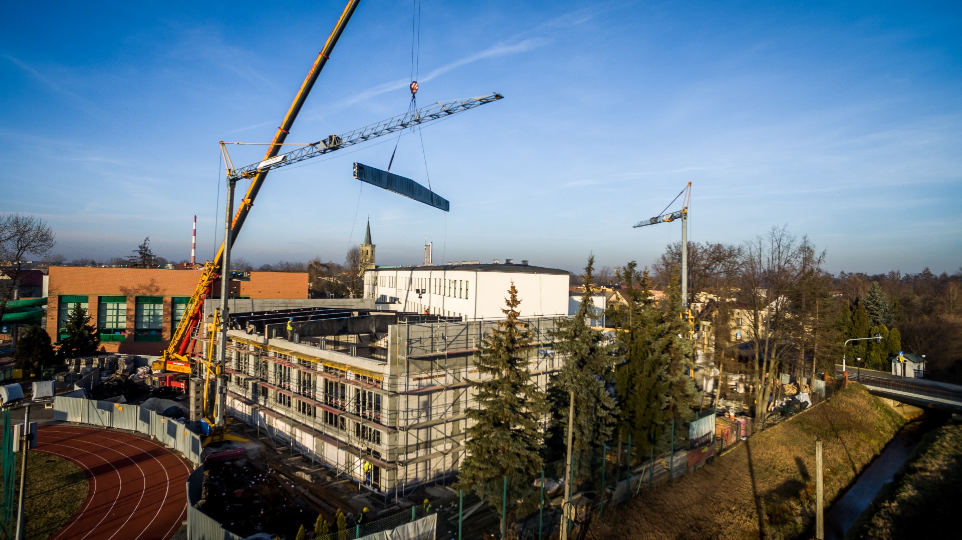 Przejeżdżając ulicą Chemików i Krakowską możemy obserwować rosnące mury sali sportowej przy Szkole Podstawowej nr 1. Inwestycja zakończy się w maju przyszłego roku, ale już teraz kubatura budynku zaczyna być widoczna. A co ciekawe, rozpoczęły się prace nad jego zadaszeniem.
